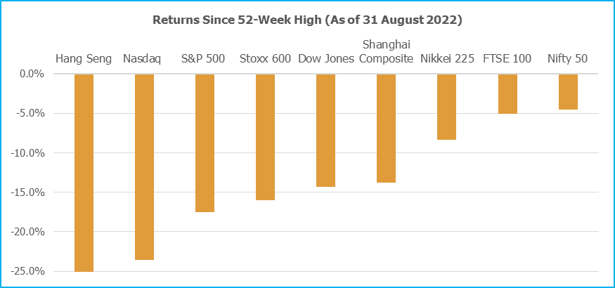 Most global indices breached the -20% mark since peak (a generalised definition of a bear market), but some like the Nikkei 225 and FTSE 100 have bounced back. The Nifty 50, too, has performed extremely well in this context. Indian equity markets have consistently outperformed international markets since the start of the year, especially during periods of sudden risk-off behaviour, which sends global markets on a down leg.