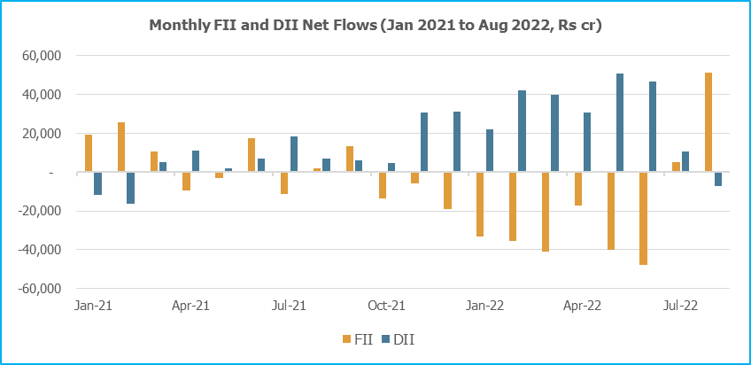 FIIs returned in August with a big bang, net buyers of Indian equities worth Rs51,241cr, while DIIs were minor net sellers. So far, this year, FIIs and DIIs have been net buyers together only in July.